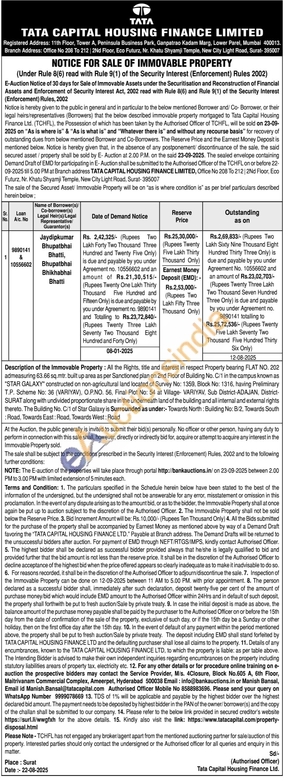 Description of the Immovable Property: All the Rights, title and interest in respect Property bearing FLAT NO. 202 admeasuring 63.66 sq.mtr. built up area as per Sanctioned plan on 2nd Floor of Building No. C/1 in the campus known as "STAR GALAXY" constructed on non-agricultural land located of Survey No: 1359, Block No: 1316, having Preliminary T.P. Scheme No: 36 (VARIYAV), O.P.NO. 56, Final Plot No: 54 at Village- VARIYAV, Sub District-ADAJAN, District-SURAT along with undivided proportionate share in the underneath land of the building and all internal and external rights thereto. The Building No. C/1 of Star Galaxy is Surrounded as under:- Towards North: Building No: B/2, Towards South : Road, Towards East: Road, Towards West: Road