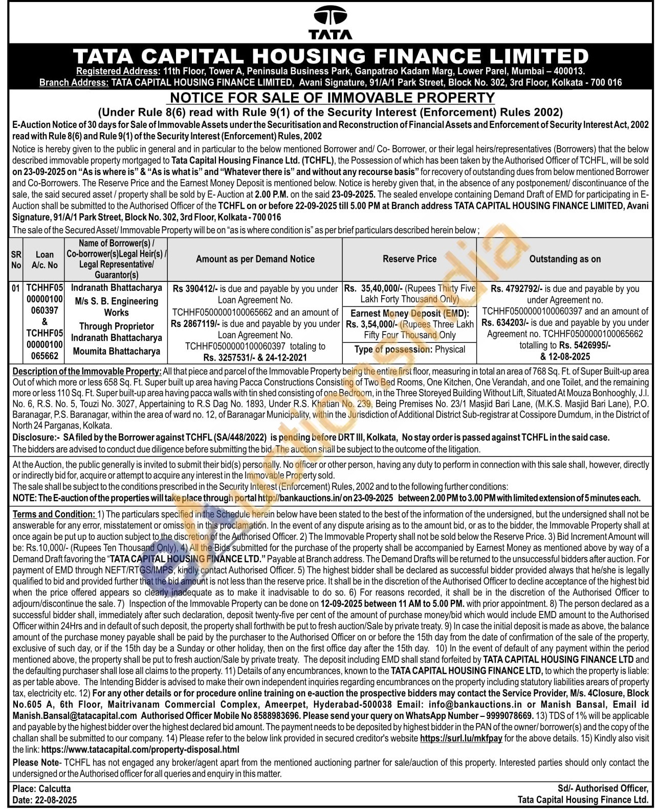 Description of the Immovable Property: All that piece and parcel of the Immovable Property being the entire first floor, measuring in total an area of 768 Sq. Ft. of Super Built-up area Out of which more or less 658 Sq. Ft. Super built up area having Pacca Constructions Consisting of Two Bed Rooms, One Kitchen, One Verandah, and one Toilet, and the remaining more or less 110 Sq. Ft. Super built-up area having pacca walls with tin shed consisting of one Bedroom, in the Three Storeyed Building Without Lift, Situated At Mouza Bonhooghly, J.J. No. 6, R.S. No. 5, Touzi No. 3027, Appertaining to R.S Dag No. 1893, Under R.S. Khatian No. 239, Being Premises No. 23/1 Masjid Bari Lane, (M.K.S. Masjid Bari Lane), P.O. Baranagar, P.S. Baranagar, within the area of ward no. 12, of Baranagar Municipality, within the Jurisdiction of Additional District Sub-registrar at Cossipore Dumdum, in the District of North 24 Parganas, Kolkata