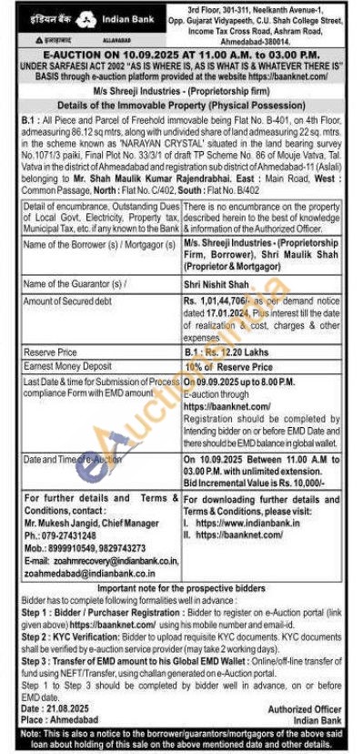 All Piece and Parcel of Freehold immovable being Flat No. B-401, on 4th Floor, admeasuring 86.12 sq mtrs, along with undivided share of land admeasuring 22 sq. mtrs in the scheme known as 'NARAYAN CRYSTAL' situated in the land bearing survey No.1071/3 paiki, Final Plot No. 33/3/1 of draft TP Scheme No. 86 of Mouje Vatva, Tal Vatva in the district of Ahmeadabad and registration sub district of Ahmedabad-11 (Asiali)