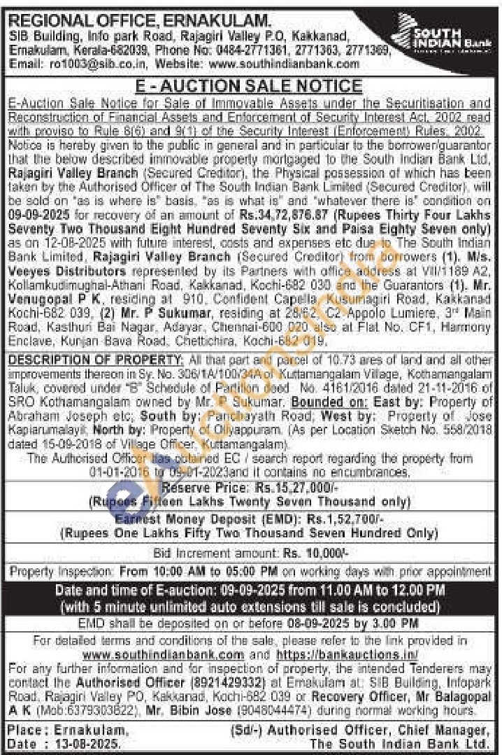 DESCRIPTION OF PROPERTY: All that part and parcel of 10.73 ares of land and all other improvements thereon in Sy. No. 306/1A/100/34A of Kuttamangalam Village, Kothamangalam Taluk, covered under "B" "B" Schedule of Partition deed No. 4161/2016 dated 21-11-2016 of SRO Kothamangalam owned by Mr. P Sukumar. Bounded on: East by: Property of Abraham Joseph elc; South by: Panchayath Road, West by: Property of Jose Kapiarumalayil, North by: Property of Oliyappuram. (As per Location Sketch No. 558/2018 dated 15-09-2018 of Village Officer, Kuttamangalam)