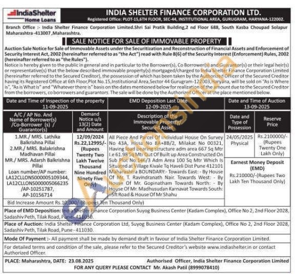 All Piece And Parcel Of Individual House On Survey No 43A, Hissa No 8A+88/2, Milakat No 00321, Having load bearing structure adm area 667 Sq Mtr le 61.98 Sq Mtr Out Of Built up Area Constructed On Sub Plot No. 146/3 Adm Area 100 50 Mtr Which is Situated at Village Kivale To Haveli Dist Pune 412101 Maharashtra BOUNDARY: Towards East By House Of Mr. T. Ravindranath Nair Towards West: By House Of Mr. Gopinatham Towards North: By House Of Mr. Madhusudan Karnavat Towards South: -5ft Road & House Of Mr Shahu