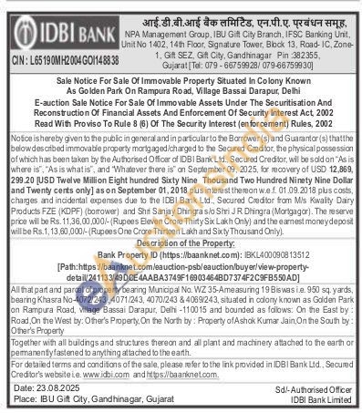 All that part and parcel of property bearing Municipal No. WZ 35-Ameasuring 19 Biswasie. 950 sq yards, bearing Khasra No-4072/243,4071/243, 4070/243 & 4069/243, situated in colony known as Golden Park on Rampura Road, village Bassai Darapur, Delhi-110015 and bounded as follows: On the East by Road, On the West by: Other's Property, On the North by: Property of Ashok Kumar Jain On the South by Other's Property