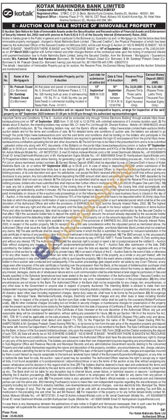 Commerical Shop No.5 Ground Floor, Mahaveer Palace. CTS 520 having hull up area of admeasuring about 175 S 15.80 Somes las per Sale Deed in commercial building located in -Rastha peth, Pune