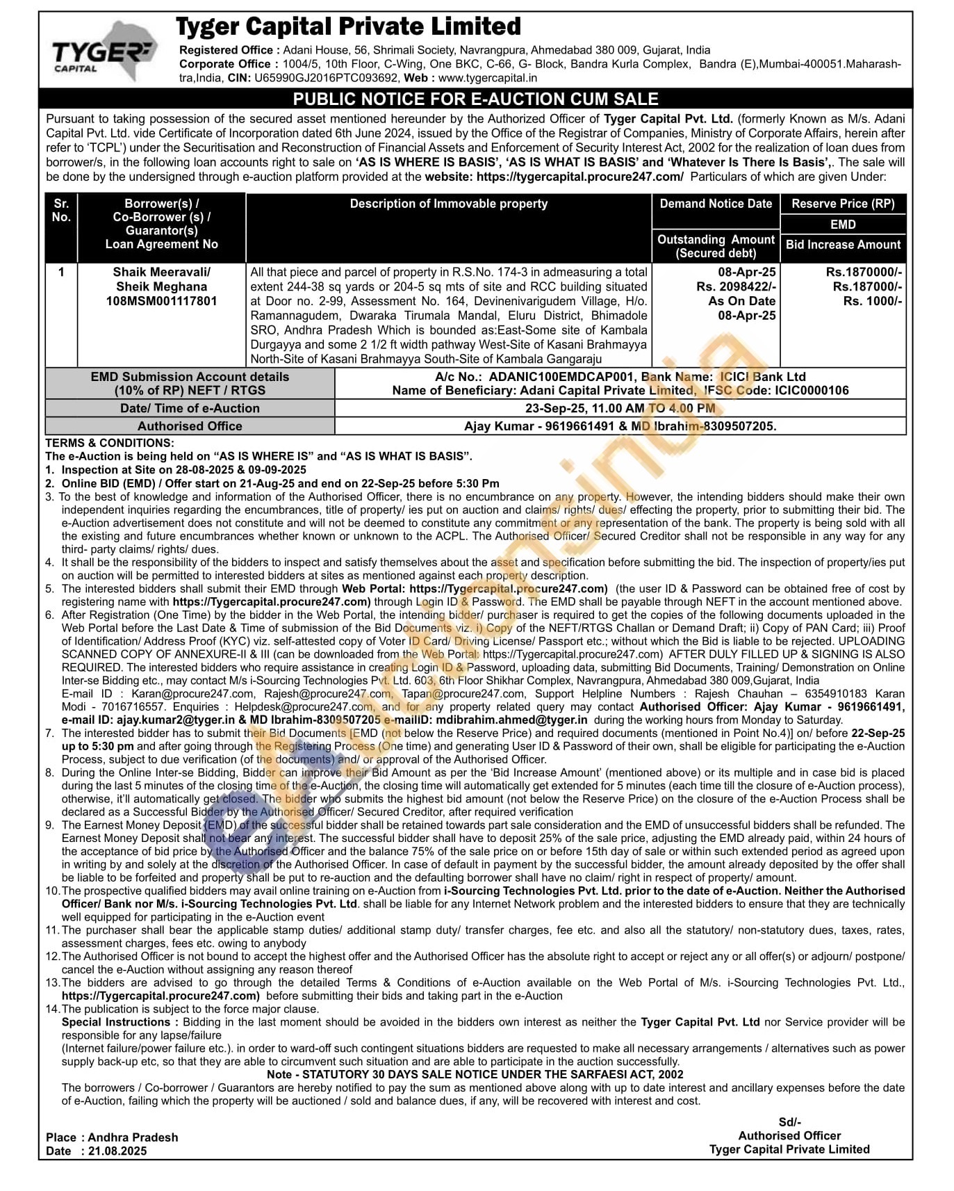 All that piece and parcel of property in R.S.No. 174-3 in admeasuring a total extent 244-38 sq yards or 204-5 sq mts of site and RCC building situated at Door no. 2-99, Assessment No. 164, Devinenivarigudem Village, H/o. Ramannagudem, Dwaraka Tirumala Mandal, Eluru District, Bhimadole SRO, Andhra Pradesh Which is bounded as: East-Some site of Kambala Durgayya and some 2 1/2 ft width pathway West-Site of Kasani Brahmayya North-Site of Kasani Brahmayya South-Site of Kambala Gangaraju