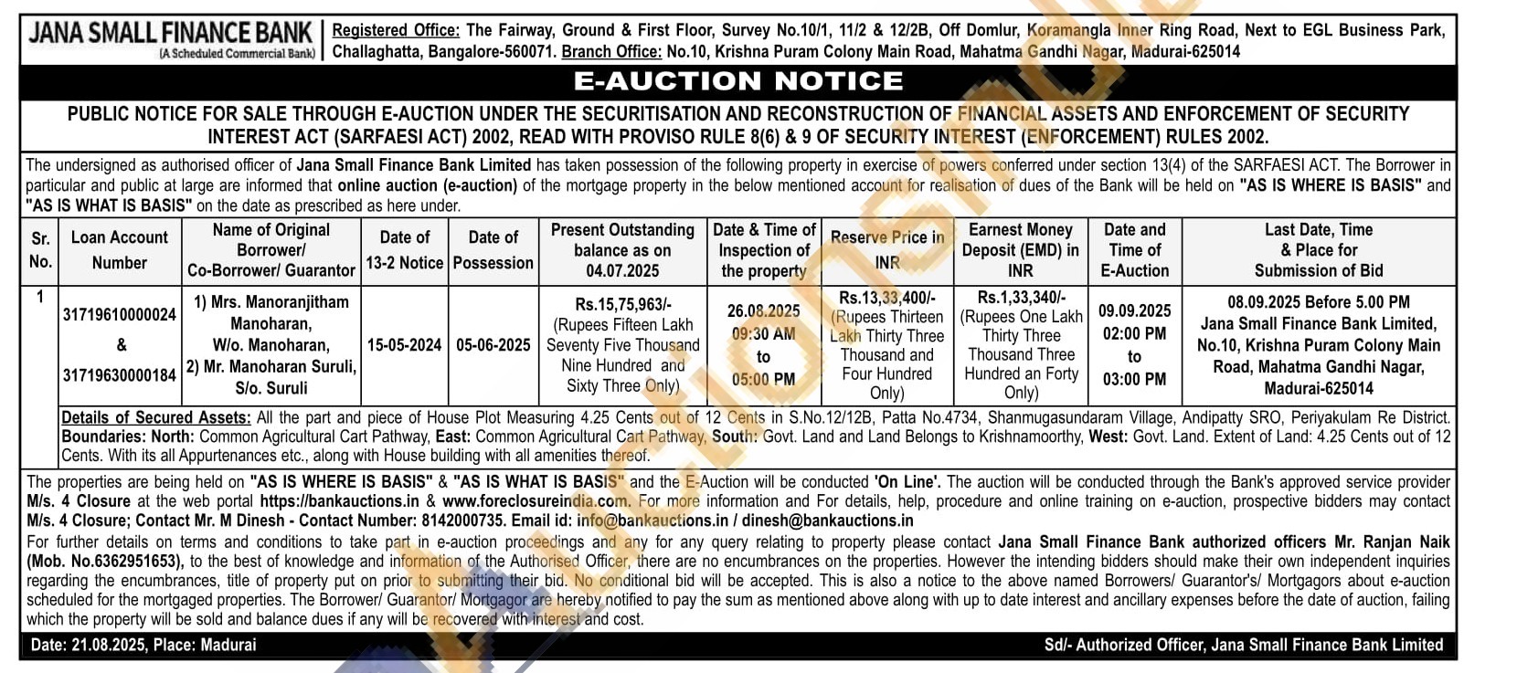 Details of Secured Assets: All the part and piece of House Plot Measuring 4.25 Cents out of 12 Cents in S.No. 12/12B, Patta No.4734, Shanmugasundaram Village, Andipatty SRO, Periyakulam Re District. Boundaries: North: Common Agricultural Cart Pathway, East: Common Agricultural Cart Pathway, South: Govt. Land and Land Belongs to Krishnamoorthy, West: Govt. Land. Extent of Land: 4.25 Cents out of 12 Cents. With its all Appurtenances etc., along with House building with all amenities thereof.