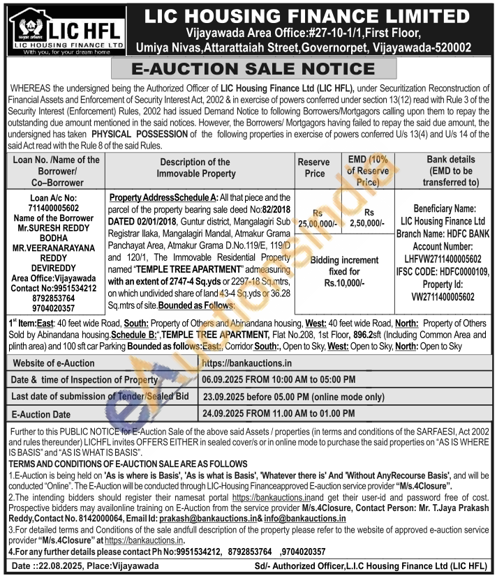 Property AddressSchedule A: All that piece and the parcel of the property bearing sale deed No:82/2018 DATED 02/01/2018, Guntur district, Mangalagiri Sub Registrar Ilaka, Mangalagiri Mandal, Atmakur Grama Panchayat Area, Atmakur Grama D.No.119/E, 119/D and 120/1, The Immovable Residential Property named "TEMPLE TREE APARTMENT" admeasuring with an extent of 2747-4 Sq.yds or 2297-18 Sq.mtrs, on which undivided share of land 43-4 Sq.yds or 36.28 Sq.mtrs of site.Bounded as Follows " Item: East: 40 feet wide Road, South: Property of Others and Abinandana housing, West: 40 feet wide Road, North: Property of Others Sold by Abinandana housing. Schedule B:", TEMPLE TREE APARTMENT, Flat No.208, 1st Floor, 896.2sft (Including Common Area and plinth area) and 100 sft car Parking Bounded as follows: East:, Corridor South:, Open to Sky, West: Open to Sky, North: Open to Sky
