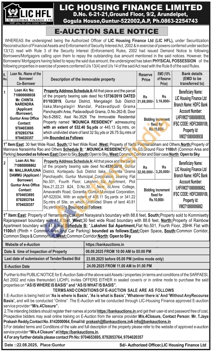 Property Address Schedule A: All that piece and the parcel of the property bearing sale deed No:4536/2018, Guntur District, Koritepadu Sub District illaka, Gorantla Grama Panchayathi, Guntur Municipal Corporation, bearing Flat No.501, Fourth Floor, Lakshmi Sai Apartment, Plot Nos.21.22,23 &24, D.No.30, Near St.Anns College, Amavarathi Road, Gorantia, Guntur Municipal Corporation, AP-522034, With an extent of 408.11 Sq.yards or 341.22 Sq.mtrs of Site, on which Undivided Share of land 40.81 Sq.yards of Site. Bounded as Follows: 1 Item: East: Property of Yerramsetty Lakshmi Narayana's boundary with 88.6 feet, South: Property sold to Kommisetty Rajarajeswari boundary with 41.6 feet, West:30 feet wide Road boundary with 88.6 feet, North: Property of Rainbow Apartment boundary with 41.6 feet. Schedule B: ",Lakshmi Sai Apartment, Flat No.501, Fourth Floor, 2BHK Flat with 1100sft (Plinth+ Common Area and Car Parking) bounded as follows:East:Open Space, South: Common Corridor, Common Steps & Common Lift, West: Common Corridor North: Open to Sky