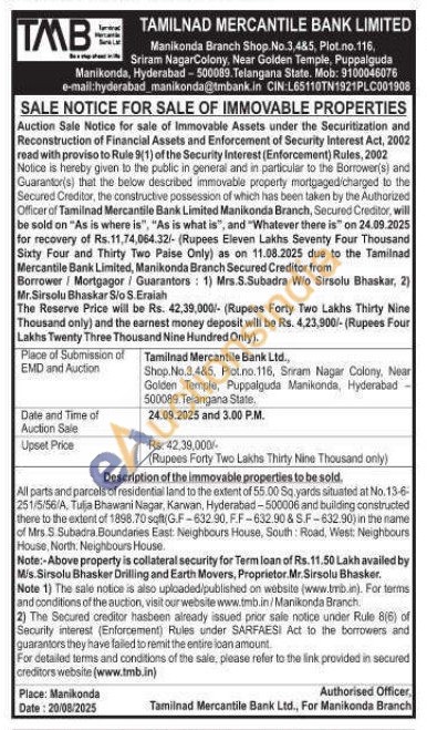 Contact Mob : 9100046076 e-mail:hyderabad_manikonda@tmbank.in