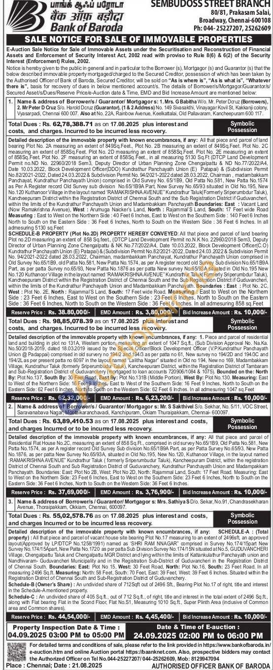 Detailed description of the immovable property with known encumbrances, if any: SCHEDULE-A: (Total property): All that piece and parcel of vacant house site bearing Plot No.17 measuring to an extent of 2496sft, an approved layout(Approved by LP/DTCP No.1258/1991) named as 'SHRI RAM NNAGAR" comprised in Survey No.174/15part New Survey No. 174/15Apart, New Patta No. 1720 as per patta Sub Division Survey No. 174/15N situated at No.5, GUDUVANCHERI Village, Chengalpattu Taluk and Chengalpattu MGR District and lying within the limits of Kattankulathur Panchayath union and Nandhivaram- Guduvancheri Municipality and in the Registration Sub-District of Guduvancheri in the Registration District of Chennai South. Boundaries: East: Plot No 15, West: 30 Feet Road, North: Plot No.16, South: 23 Feet Road. In all measuring 2496 Sq.ft. Measuring: North: 58 Feet, South: 70 Feet, East: 39 Feet, West: 39 Feet 6 Inches. Situated within the Registration District of Chennai South and Sub-Registration District of Guduvanchery. Schedule-B (Owner's Share): An undivided share of 712Sqft out of 2496 Sft., Bearing Plot No. 17 of right, title and interest in the Schedule-A mentioned property. Schedule-C: An undivided share of 405 Sq.ft., out of 712 Sq.ft., of right, title and interest in the total extent of 2496 Sq.ft., along with Flat bearing Flat in the Scond Floor, Flat No.S1, Measuring 1010 Sq.ft., Super Plinth Area (indusive of Common area and Common shares).