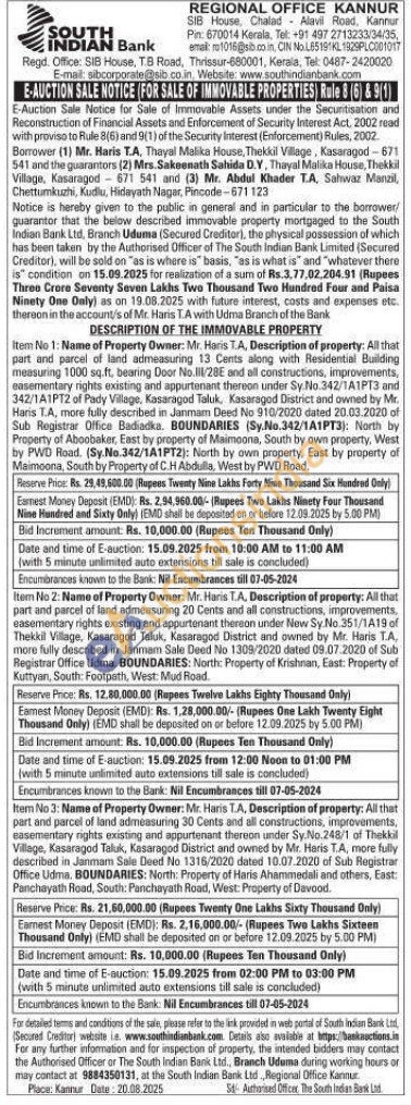 DESCRIPTION OF THE IMMOVABLE PROPERTY : Item No 3: Name of Property Owner: Mr. Haris T.A, Description of property: All that part and parcel of land admeasuring 30 Cents and all constructions, improvements, easementary rights existing and appurtenant thereon under Sy.No.248/1 of Thekkil Village, Kasaragod Taluk, Kasaragod District and owned by Mr. Haris T.A, more fully described in Janmam Sale Deed No. 1316/2020 dated 10.07.2020 of Sub Registrar Office Udma. BOUNDARIES: North: Property of Haris Ahammedali and others, East: Panchayath Road, South: Panchayath Road, West: Property of Davood