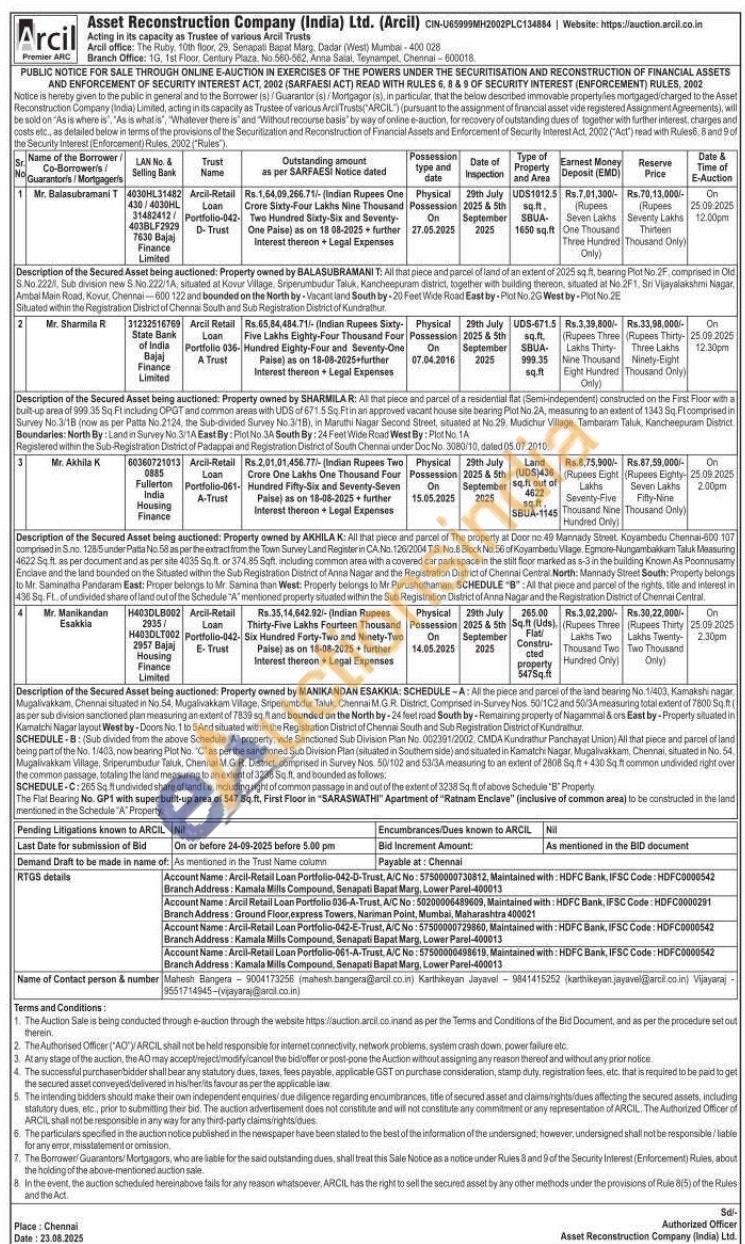 Description of the Secured Asset being auctioned: Property owned by AKHILA K: All that piece and parcel of The property at Door no.49 Mannady Street, Koyambedu Chennai-600 107 comprised in Sino 128/5 under Patta No. 58 as per the extract from the Town Survey Land Register in CA No. 126/2004 TS. No Block No.56 of Koyambedu Vilage. Egmore-Nungambakkam Taluk Measuring 4622 Sqft as per document and as per site 4035 Sq ft. or 374.85 Saft. including common area with a covered car park space in the stilt floor marked as a-3 in the building Known As Poonnusamy Enclave and the land bounded on the Situated within the Sub Registration District of Anna Nagar and the Registration District of Chennai Central North: Mannady Street South: Property belongs to Mr. Saminatha Pandaram East: Proper belongs to Mr. Samina than West: Property belongs to Mr.Purushothaman SCHEDULE "B": All that piece and parcel of the rights. title and interest in 436 Sq. Ft, of undivided share of land out of the Schedule "A" mentioned property situated within the Sub Registration District of Anna Nagar and the Registration District of Chennai Central