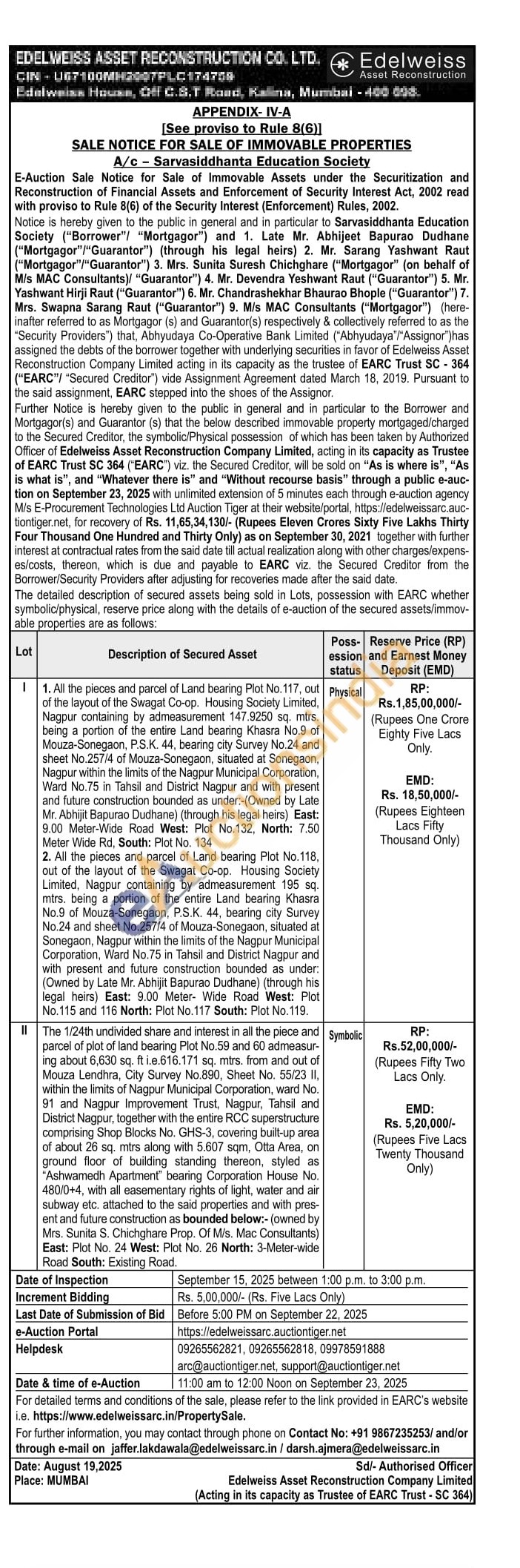 11. All the pieces and parcel of Land bearing Plot No.117, out of the layout of the Swagat Co-op. Housing Society Limited, Nagpur containing by admeasurement 147.9250 sq. mtrs. being a portion of the entire Land bearing Khasra No.9 of Mouza-Sonegaon, P.S.K. 44, bearing city Survey No.24 and sheet No.257/4 of Mouza-Sonegaon, situated at Sonegaon, Nagpur within the limits of the Nagpur Municipal Corporation, Ward No.75 in Tahsil and District Nagpur and with present and future construction bounded as under-(Owned by Late Mr. Abhijit Bapurao Dudhane) (through his legal heirs) East: 9.00 Meter-Wide Road West: Plot No.132, North: 7.50 Meter Wide Rd, South: Plot No. 134 2. All the pieces and parcel of Land bearing Plot No. 118, out of the layout of the Swagat Co-op. Housing Society Limited, Nagpur containing by admeasurement 195 sq. mtrs. being a portion of the entire Land bearing Khasra No.9 of Mouza-Sonegaon, P.S.K. 44, bearing city Survey No.24 and sheet No.257/4 of Mouza-Sonegaon, situated at Sonegaon, Nagpur within the limits of the Nagpur Municipal Corporation, Ward No.75 in Tahsil and District Nagpur and with present and future construction bounded as under: (Owned by Late Mr. Abhijit Bapurao Dudhane) (through his legal heirs) East: 9.00 Meter Wide Road West: Plot No.115 and 116 North: Plot No.117 South: Plot No. 119