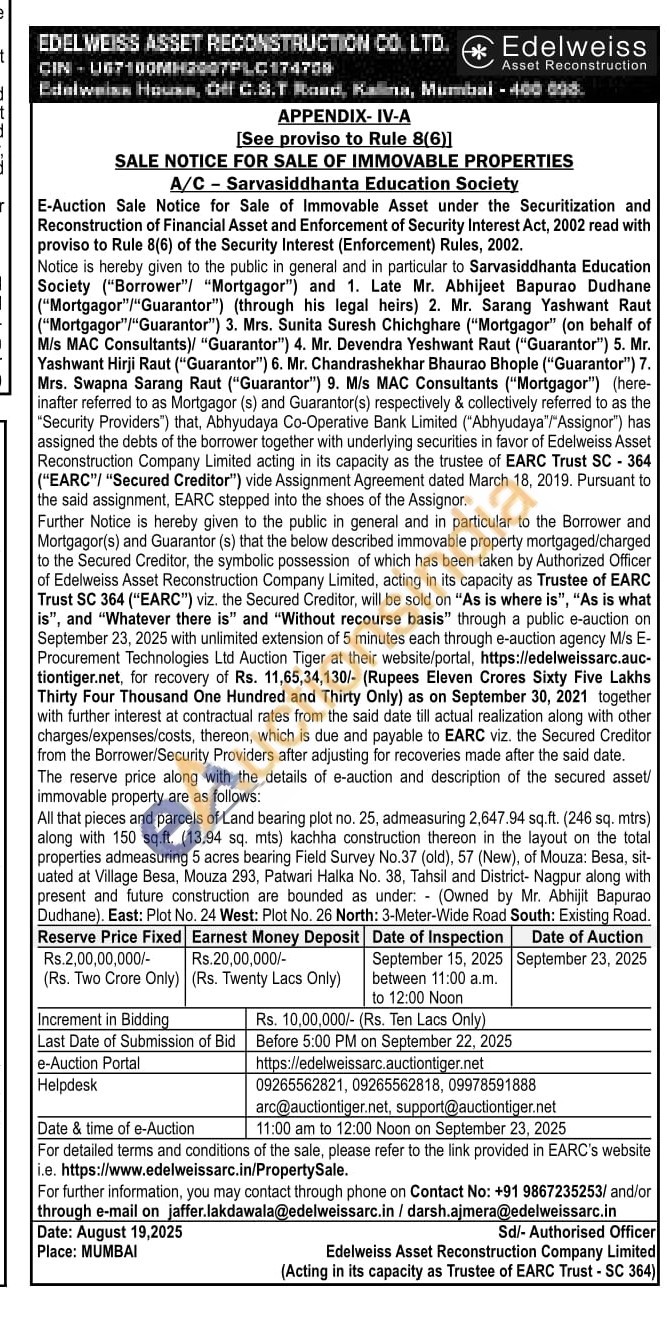All that pieces and parcels of Land bearing plot no. 25, admeasuring 2,647.94 sq.ft. (246 sq. mtrs) along with 150 sq.ft. (13.94 sq. mts) kachha construction thereon in the layout on the total properties admeasuring 5 acres bearing Field Survey No.37 (old), 57 (New), of Mouza: Besa, sit-uated at Village Besa, Mouza 293, Patwari Halka No. 38, Tahsil and District- Nagpur along with present and future construction are bounded as under: (Owned by Mr. Abhijit Bapurao Dudhane). East: Plot No. 24 West: Plot No. 26 North: 3-Meter-Wide Road South: Existing Road.