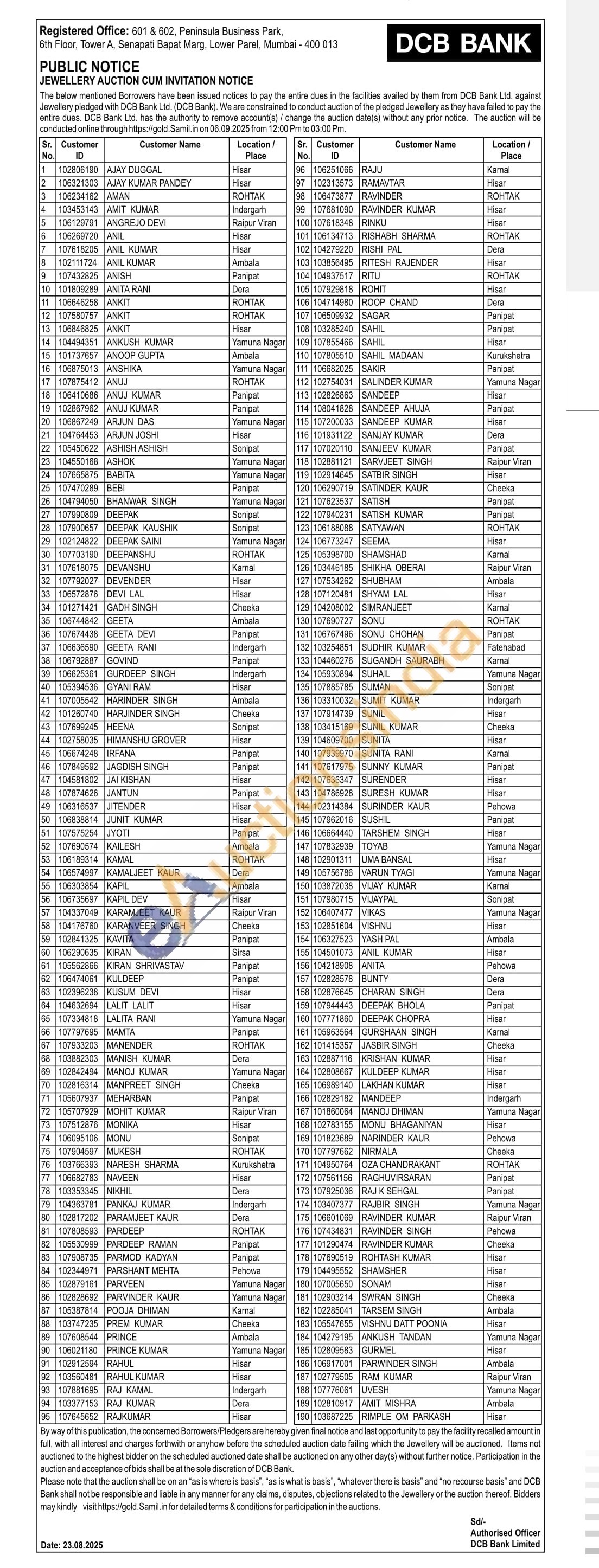 DCB Bank Gold Auctions Auction in Hisar