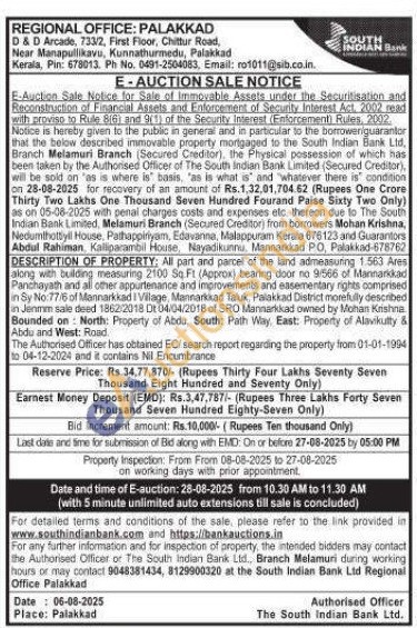 DESCRIPTION OF PROPERTY: All part and parcel of the land admeasuring 1.563 Ares along with building measuring 2100 Sq Ft (Approx) bearing door no 9/566 of Mannarkkad Panchayath and all other appurtenance and improvements and easementary nights comprised in Sy No:77/6 of Mannarkkad I Vilage, Mannarkkad Taluk, Palakkad District morefully described in Jenmm sale deed 1862/2018 Dt 04/04/2018 of SRO Mannarkkad owned by Mohan Krishna Bounded on: North: Property of Abdu, South: Path Way. East: Property of Alavikulty & Abdu and West: Road The Authorised Officer has obtained EC/search report regarding the property from 01-01-1994 04-12-2024 and it contains Nil Encumbrance