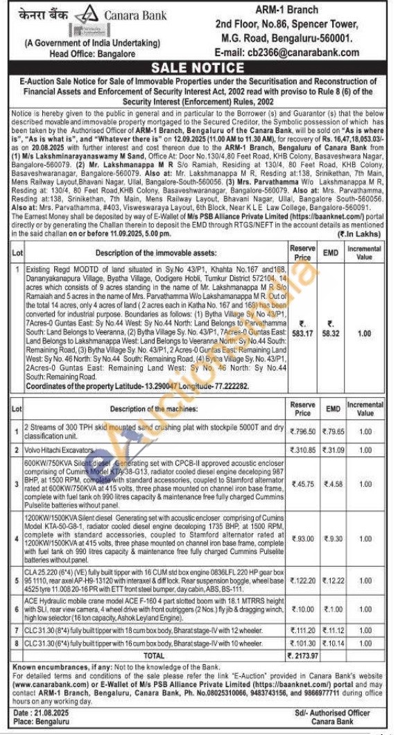 contact ARM-1 Branch Ph. No.08025310066, 9483743156, and 9866977711
