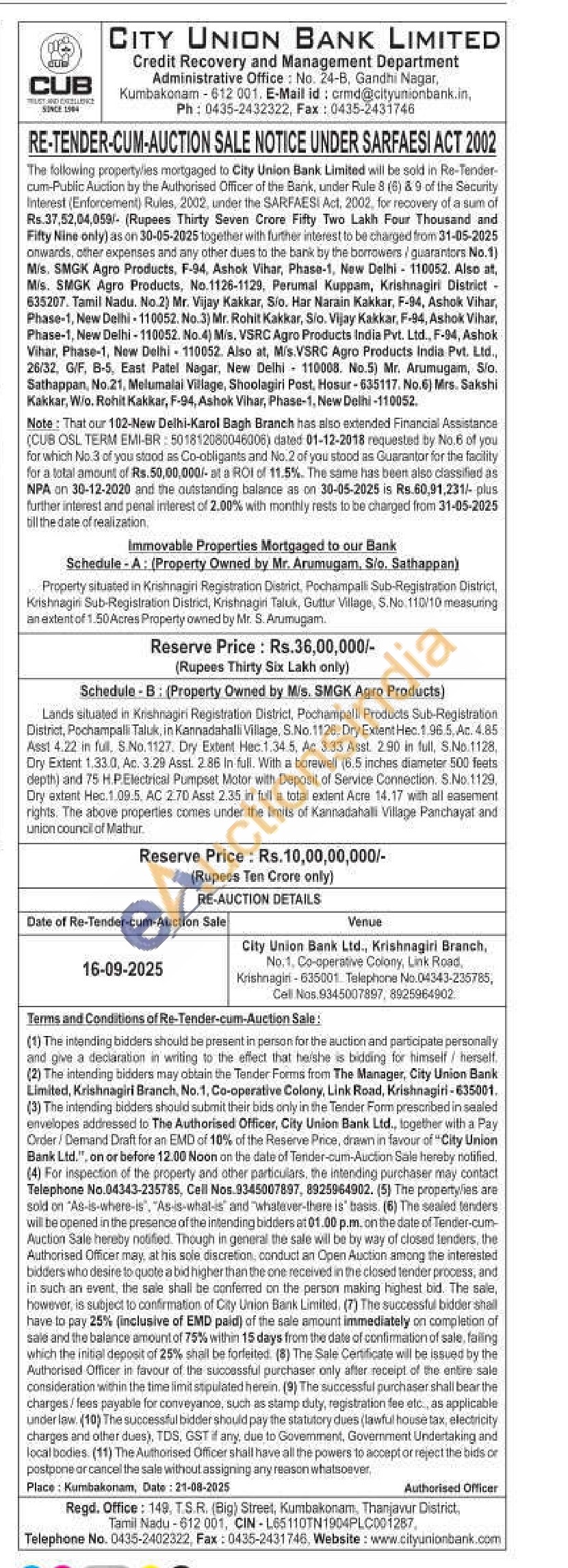 Schedule-A: (Property Owned by Mr. Arumugam, Sio. Sathappan) Property situated in Krishnagiri Registration District, Pochampalli Sub-Registration District, Krishnagiri Sub-Registration District, Krishnagiri Taluk, Guttur Village, S.No. 110/10 measuring an extent of 1.50 Acres Property owned by Mr. S. Arumugam.