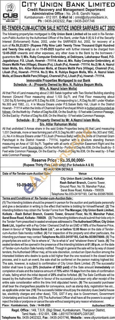 Schedule-A: (Property Owned by Mrs. N. Rubiya Begum Molla, W/o. A. Nazrul Islam Molla) All that Plot of Land measuring about 2.583 Satak together with Two Storied Building standing thereon (Ground Floor measuring about 1,103 Sq.Ft. and First Floor measuring about 1,250 Sq.ft) forming part of R.S.Dag No.638, Corresponding to L.R.Dag No.661 under Khatian No.303 and 1582, J.L 4 in Mouza Eksara under P.S.Sabek Bally Hal, Liluah in the District Howrah-711114 within the limits of Chamrail Gram Panchayat Which is butted and bounded as follows:- On the North by-Portion of Dag No.638, On the South by-5 Feet wide Common Passage, On the East by-Portion of Dag No.638, On the West by-5 Feet wide Common Passage. Schedule B: (Property Owned by Mr. A.Nazrul Islam Molla, S/o. Atilar Rahuman Molla) All that undivided 3 Annas share in the said Entire Properties being All that Land measuring 1.031 Decimals, more or less forming part of R.S.Dag No.661 under Khatian No.303 and 1582, J.L.No.4 in Mouza Eksara under P.S.Liluah (Previous Bally) within the limits of Chamrail Gram Panchayat in the District Howrah 711114, together with a structure standing thereon measuring an Area of 120 Sq.Ft. Together with all sorts of Common Easement Right and the said Premises/Land. Boundaries:- On the North by-Portion of Dag No.638, On the South by-5 Feet wide Common Passage, On the East by - Portion of Dag No.638, On the west by-5 Feet wide Common Passage.