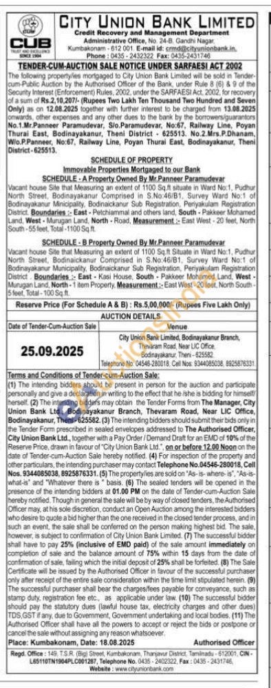 Vacant house Site that Measuring an extent of 1100 Sq.ft Situate in Ward No:1, Pudhur North Street, Bodinaickanur Comprised in S.No.46/B1, Survey Ward No:1 of Bodinayakanur Municipality, Bodinaickanur Sub Registration, Periyakulam Registration District Boundaries: East Kasi House, South Pakkeer Mohamed Land, West-Murugan Land, North-1 item Property, Measurement:-East West-20 feet, North South-5 feet, Total-100 Sq.ft.