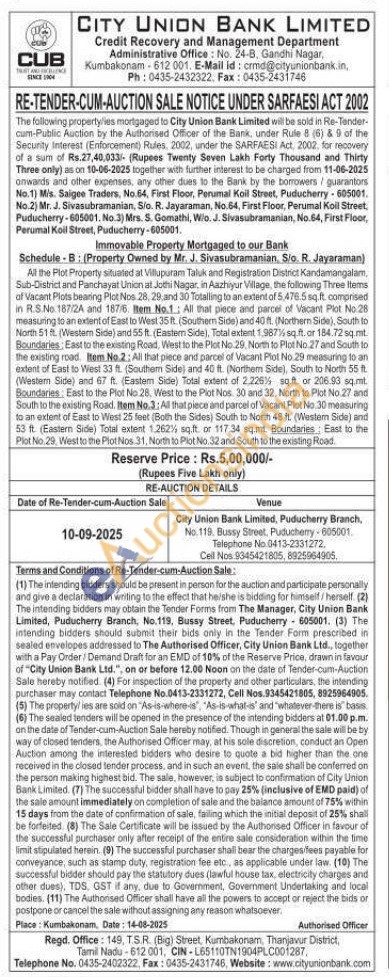 All the Plot Property situated at Villupuram Taluk and Registration District Kandamangalam, Sub-District and Panchayat Union at Jothi Nagar, in Aazhiyur Village, the following Three Items of Vacant Plots bearing Plot Nos 28, 29 and 30 Totalling to an extent of 5,476.5 sq.ft. comprised in R.S.No 187/24 and 187/6. Bem No.1 All that piece and parcel of Vacant Plot No 28 measuring to an extent of East to West 35 ft. (Southern Side) and 40 ft. (Northern Side), South to North 51 ft. (Western Side) and 55 ft. (Eastem Side), Total extent 1.987% sq.ft. or 184.72 sq.mt. Boundaries: East to the existing Road, West to the Plot No 29, North to Plot No 27 and South to the existing road. Hem No.2: All that plece and parcel of Vacant Plot No.29 measuring to an extent of East to West 33 ft. (Southem Side) and 40 ft. (Northem Side), South to North 55 ft (Western Side) and 67 ft. (Eastem Side) Total extent of 2.226% sq.ft. or 206.93 sq.mt. Boundaries: East to the Plot No.28, West to the Plot Nos. 30 and 32. North to Plot No 27 and South to the existing Road. Item No.3: All that piece and parcel of Vacant Plot No. 30 measuring to an extent of East to West 25 feet (Both the Sides) South to North 48 ft. (Westem Side) and 53 ft. (Eastern Side) Total extent 1,262% sq.ft. or 117.34 sq.mt. Boundaries: East to the Plot No.29, West to the Plot Nos 31, North to Plot No. 32 and South to the existing Road.