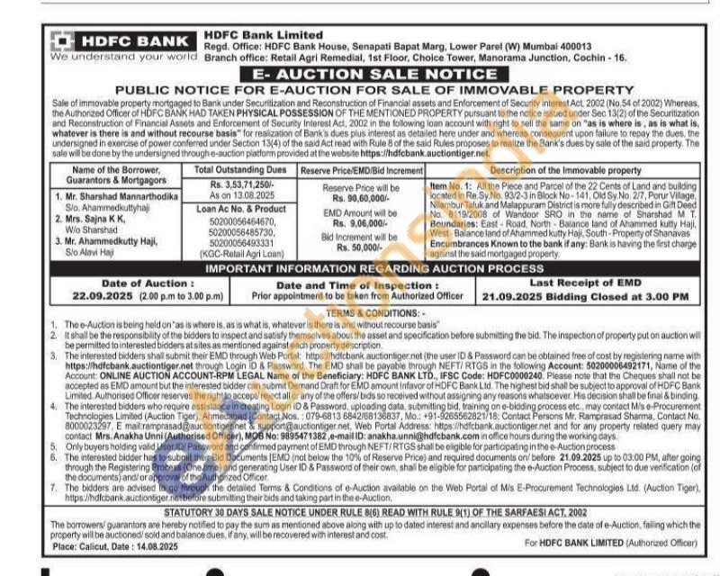 Item No. 1: All the Piece and Parcel of the 22 Cents of Land and building located in Re Sy.No. 93/2-3 in Block No-141, Old Sy. No. 2/7, Porur Village, Nilambur Taluk and Malappuram District is more fully described in Gift Deed No. 8119/2008 of Wandoor SRO in the name of Sharshad MT. Boundaries: East Road, North Balance land of Ahammed kutty Haji West-Balance land of Ahammed kutty Haji, South-Property of Shanavas Encumbrances Known to the bank if any. Bank is having the first charge against the said mortgaged property