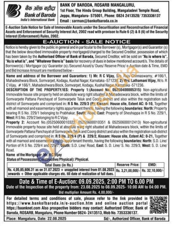DESCRIPTION OF THE PROPERTY/IES: Property 1: (Account No. 05250400005315) Non-agricultural Immovable house site property held on absolute warg right situated at Mahadeswara block, within the limits of Somvarpete Pattana Panchayat of Somvarpete Taluk and Coorg district and also within the registration sub district of Somvarpete and comprised in: R S No. 229/3 (P), Kissam: House site, Extent AC: 0-10, Together with all mamool and easementary rights appurtenant thereto, having the following boundaries: North: Property bearing R S No. 229/1 belonging to Prabhakar, South: Road, East: Property of Sheshappa in R S No. 229/1, West: RS No. 229/2 belonging to RC Vijay.