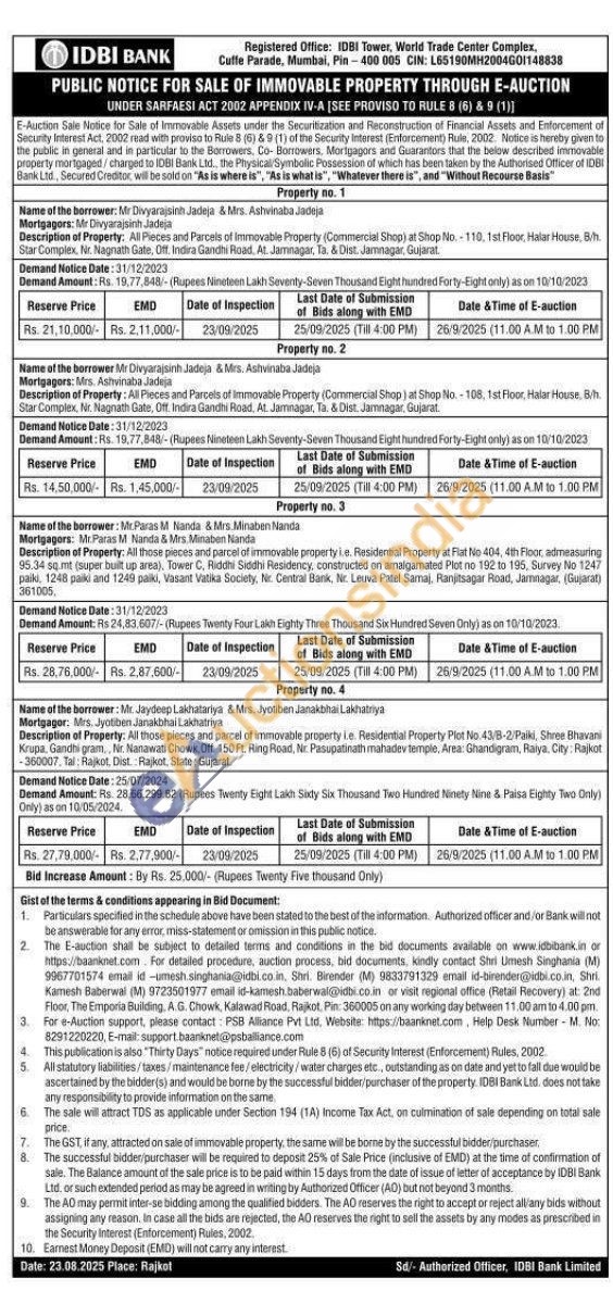All those pieces and parcel of immovable property ie. Residential Property Plot No.43/B-2/Paiki, Shree Bhavani Krupa, Gandhi gram, Ni: Nanawati Chowk Off 150 Ft. Ring Road, Nr. Pasupatinath mahadev temple, Area: Ghandigram, Raiya, City: Rajkot 360007, Tal: Rajkot, Dist Rajkot, State: Gujarat
