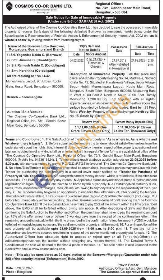 Description of Immovable Property: All that piece and parcel of A-Khata Property bearing No. 14, Madiwala, Notified Khata No. 42, Situated at Haralakunte Village, Begur Village, Begur Hobli. Muneshwara Layout. Kudlu Main Road, Bengaluru South Taluk, Bengaluru-560068. Measuring East to West 40.00 Feet & North to South 30.00 Feet. Totally Measuring 1,200.00 Sq. Feet together with all rights, appurtenances, whatsoever whether underneath or above the surface bounded by following boundaries. East by: 25 Feet Road, West by: Property of Vasantha lyengar, North by: Site No. 15. South by: Site No. 13