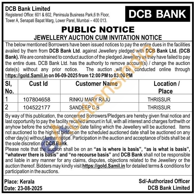 DCB Bank Gold Auctions Auction in Thrissur