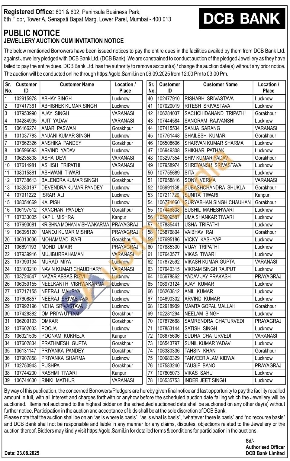 DCB Bank Gold Auctions Auction in Lucknow