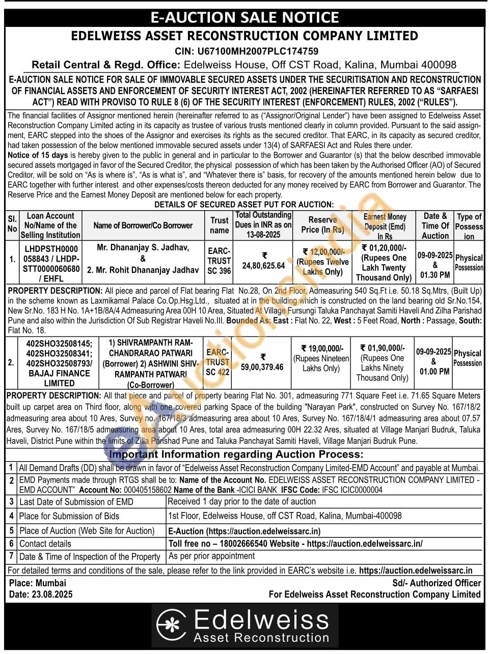 PROPERTY DESCRIPTION: All that piece and parcel of property bearing Flat No. 301, admeasuring 771 Square Feet i.e. 71.65 Square Meters built up carpet area on Third floor, along with one covered parking Space of the building "Narayan Park", constructed on Survey No. 167/18/2 admeasuring area about 10 Ares, Survey no. 167/18/3 admeasuring area about 10 Ares, Survey No. 167/18/4/1 admeasuring area about 07.57 Ares, Survey No. 167/18/5 admeasuring area about 10 Ares, total area admeasuring 00H 22.32 Ares, situated at Village Manjari Budruk, Taluka Haveli, District Pune within the limits of Zilla Parishad Pune and Taluka Panchayat Samiti Haveli, Village Manjari Budruk Pune