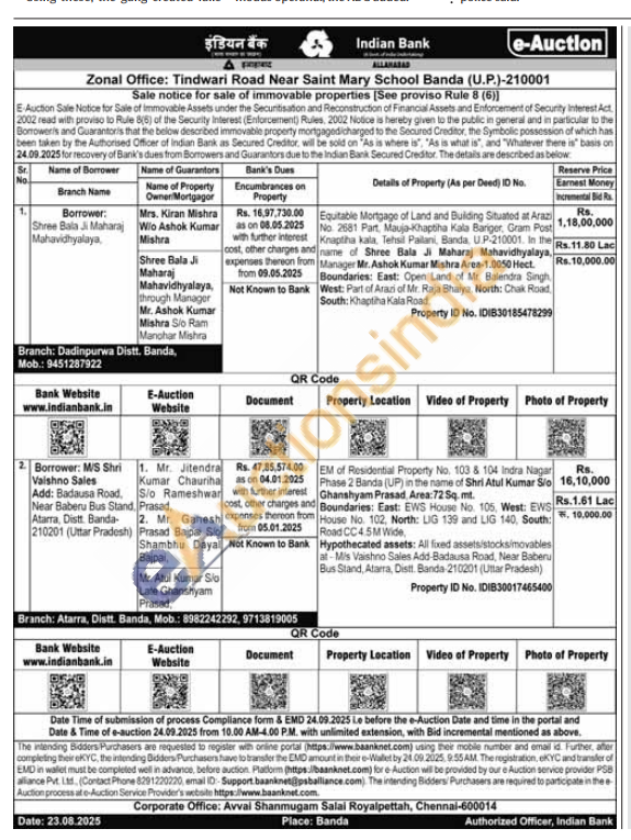 Boundaries: East: EWS House No. 105, West: EWS House No. 102, North: LIG 139 and LIG 140, South: Road CC4.5M Wide, Hypothecated assets: All fixed assets/stocks/movables at-M/s Vaishno Sales Add-Badausa Road, Near Baberu Bus Stand, Atarra, Distt. Banda-210201 (Uttar Pradesh)