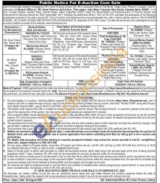 All that part and parcel of the property bear-ing Flat No. LIG-A 438, Unique Shree Sarang Balwanta. Nasirabad, Ajmer, Rajasthan, India 305601area Admeasuring Carpet Area, in Sq. Ft) Property Type Carpet Area Super Built Up Area Property Area 451.76.551.25