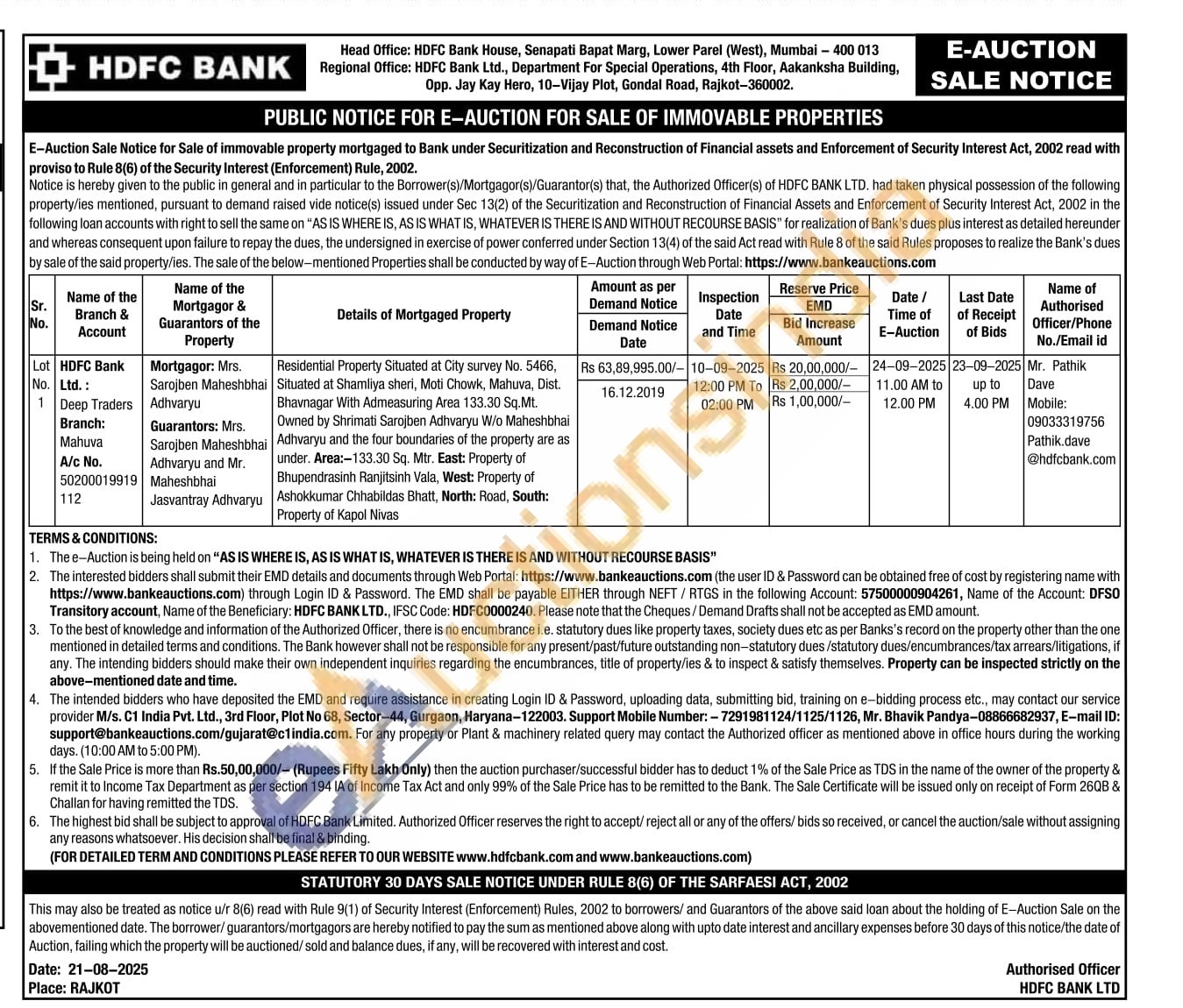 Residential Property Situated at City survey No. 5466, Situated at Shamliya sheri, Moti Chowk, Mahuva, Dist. Bhavnagar With Admeasuring Area 133.30 Sq.Mt. Owned by Shrimati Sarojben Adhvaryu W/o Maheshbhai Adhvaryu and the four boundaries of the property are as under. Area:-133.30 Sq. Mtr. East: Property of Bhupendrasinh Ranjitsinh Vala, West: Property of Ashokkumar Chhabildas Bhatt, North: Road, South: Property of Kapol Nivas