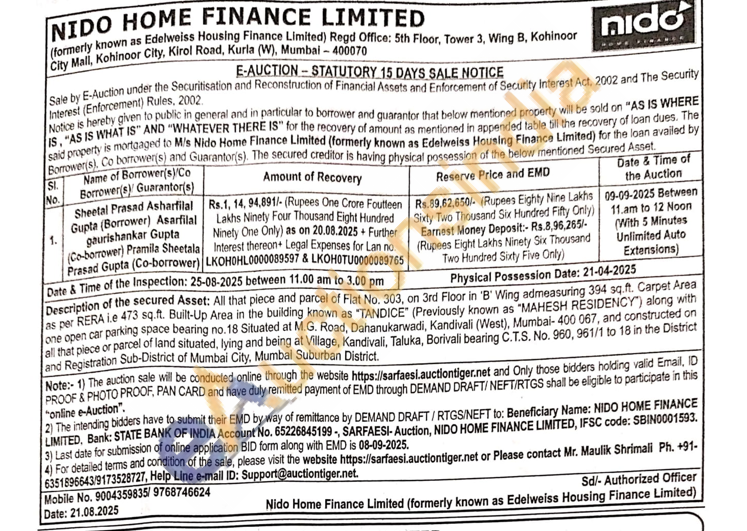 1) All that piece and parcel of Flat No. 303, on 3rd Floor in 'B' Wing admeasuring 394 sq.ft. Carpet Area as per RERA i.e 473 sq.ft. Built-Up Area in the building known as "TANDICE" (Previously known as "MAHESH RESIDENCY") along with one open car parking space bearing no. 18 Situated at M.G. Road, Dahanukarwadi, Kandivali (West), Mumbai-400 067, and constructed on all that piece or parcel of land situated, lying and being at Village, Kandivali, Taluka, Borivali bearing C.T.S. No. 960, 961/1 to 18 in the District and Registration Sub-District of Mumbai City, Mumbai Suburban District.