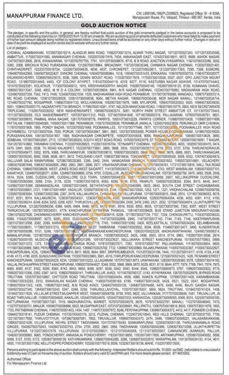 Manappuram Finance Ltd Gold Auctions Auction in Chennai