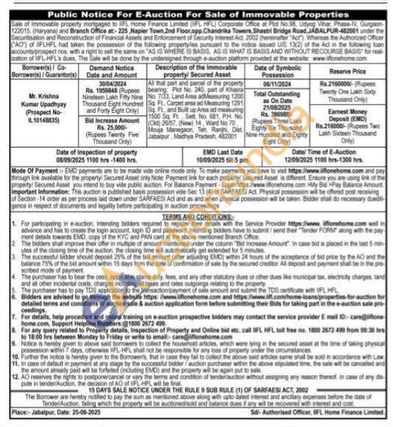 All that part and parcel of the property bearing Plot No 240, part of Khasra No. 7/33, Land Area adMeasuring 1200 Sq. Ft. Carpet arsa ad Measuring 1291 Sq. Ft, and Built up Area ad measuring 1500 Sq Ft. Sett. No. 681, PH. No. (Old) 26/57 (New) 14, Ward No 70. Mouja Manegaon, Teh. Ranjh, Dist Jabalpur Madhya Pradesh, 482001