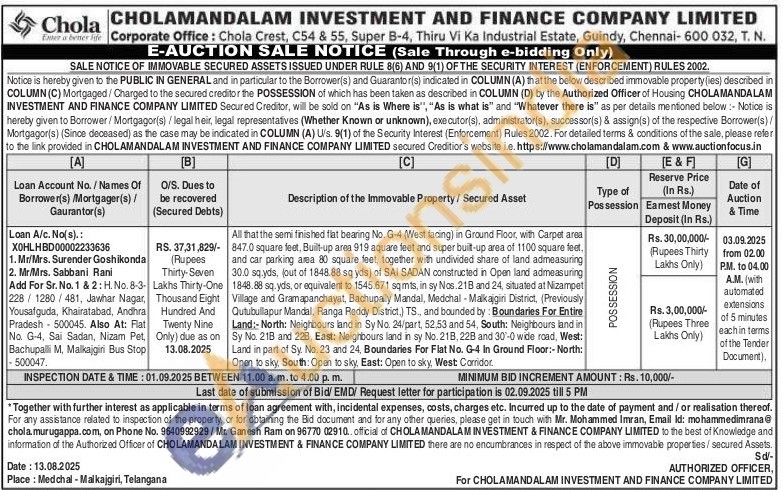 All that the semi finished fiat bearing No. G-4 (West facing) in Ground Floor, with Carpet area 847.0 square feet, Built-up area 919 aquare feet and super built-up area of 1100 square feet, and car parking area 80 square feet, together with undivided share of land admeasuring 30.0 sq.yds, (out of 1848.88 sq yds) of SAI SADAN constructed in Open land admeasuring 1848.88 sq. yds, or equivalent to 1545.671 sqmts, in sy Nos. 21B and 24, situated at Nizampet Village and Gramapanchayat, Bachupally Mandal, Medchal-Malkajgiri District, (Previously Qutubullapur Mandal, Ranga Reddy District,) TS., and bounded by: Boundaries For Entire Land:- North: Neighbours land in Sy No. 24/part, 52,53 and 54, South: Neighbours land in Sy No. 21B and 228, East: Neighbours land in sy No. 218. 228 and 30'-0 wide road, West: Land in part of Sy. No. 23 and 24, Boundaries For Flat No. G-4 In Ground Floor:- North: Open to sky, South: Open to sky, East: Open to sky, West Corridor.