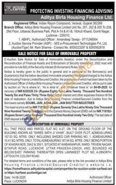 ALL THAT PIECE AND PARCEL FLAT NO. A-27, ON THE GROUND FLOOR OF THE BUILDING KNOWN AS "SHREE NATH JI VIHAR, BUILT OVER PLOT, ADMEAS-URING 157.53 SQ. MTRS. ONLY INCLUDING SHEDED CAR PARKING NO. 1. ADMEASURING 10.41 SQ. MTRS. ONLY, TOTALADMEASURING 167.94 SQ. MTRS ONLY, BEING PORTION OF KHASRA NOS. 354/2 & 355/1, SITUATED AT AHIBARANPUR, WARD-TRIVENI NAGAR, SITAPUR ROAD, LUCKNOW, UTTAR PRADESH-226020, AND, BOUNDED AS BELOW EAST PARKING THEREAFTER OPEN LAWNWEST: PLOT NO. A-28NORTH: LIFTSOUTH: COLONY ROAD