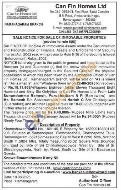 Khaneshuwari Katha No. 182/145, E-Property No. 152900103301100 206, Situated at Samandipura, Elethotadahalli, Channapatna Taluk, Ramanagaram-562159 measuring East to West 8.2296 Mtrs, North to South 11.5824 Mtrs, Totally measuring 95.32 Square Mtrs. Bounded on: East by: Site of Sri Chikkalingegowda, West by: Site of Sri Shivalingegowda, North by: Road, South by: Site of Sri Basavaraje Gowda.