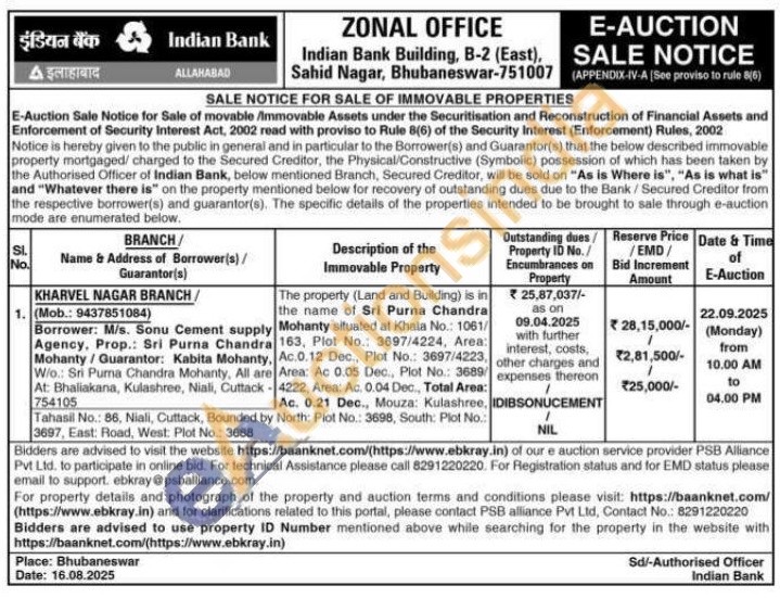 The property (Land and Building) is in the name of Sri Purna Chandra Mohanty situated at Khata No.: 1061/163, Plot No.: 3697/4224, Area: Ac.0.12 Dec., Plot No.: 3697/4223, Area: Ac 0.05 Dec., Plot No.: 3689 Cuttack-4222, Area: Ac. 0.04 Dec., Total Area: Ac. 0.21 Dec., Mouza: Kulashree,Tahasil No.: 86, Niali, Cuttack, Bounded by North: Plot No.: 3698, South: Plot No.: 3697, East: Road, West: Plot No.: 3688