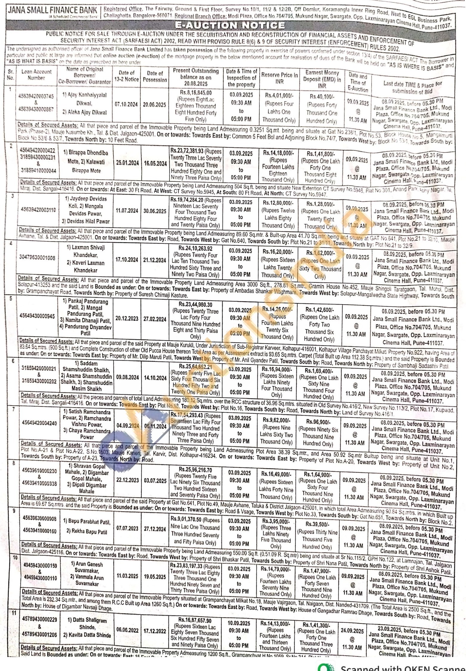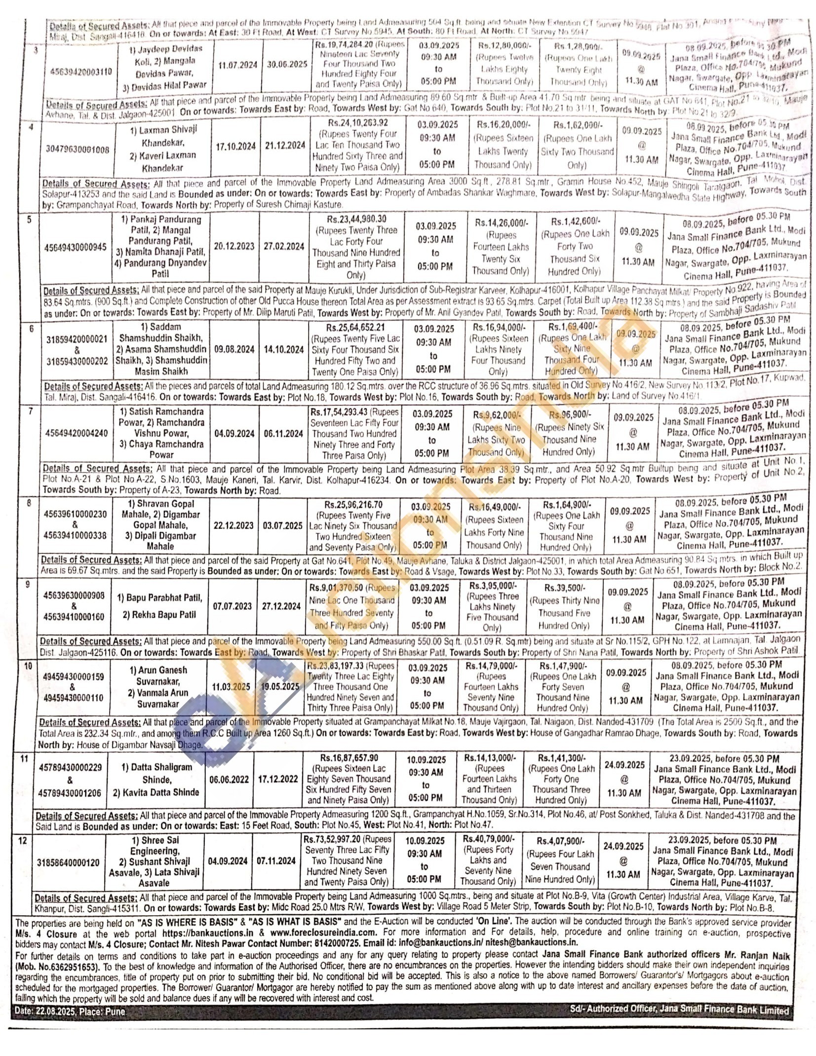 9) All that piece and parcel of the Immovable Property being Land Admeasuring 550.00 Sq ft. (0.51.09 R. Sq mtr) being and situate at Sr No. 115/2, GPH No.122. at Lamnajan, Tal. Jalgaon Dist. Jalgaon-425116. On or towards: Towards East by: Road. Towards West by: Property of Shri Bhaskar Patil, Towards South by: Property of Shri Nana Patil, Towards North by: Property of Shri Ashok Patil