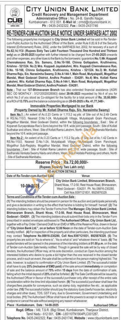 Item No.1: An extent of Ac 0.23 Cents or 1,113.2 aq yds. of Site out of Ac 2.49 Cents In RS.No. 110/3, Nearest D.No. 1-24, Mutyalapaili Vilage, Mutyalapali Gram Panchayat, Mogalthur Mandal, West Godavan District, within the following boundaries East Site of Kopanati Suryaprakasa Rao's Sons beyond the 18 ft. wide joint passage, South: Site of Kollati Sudhakar and others, West: Site of Kolati Rama Lakshmi, North: Site of Sadhanala Manibabu beyond the 10 ft. wide joint passage. Item No.2: An extent of Ac 0.23 Cents or 1,113.2 Sq.yds of Site out of Ac.1.42 Cents in RS No 110/2, Nearest D. No. 1-24, Mutyalapalli Village, Mutyalapalli Gram Panchayat, Mogalthur Sub-Registry, Mogalthur Mandal, West Godavari District, within the following boundaries: East Site of Kollati Rama Lakshmi and 10 ft. wide passage, South: Site of Sadhanala Venkata Swamy Naidu and others, West: Site of Addala Peddiraju and others, North Site of Sadhanala Manibabu.