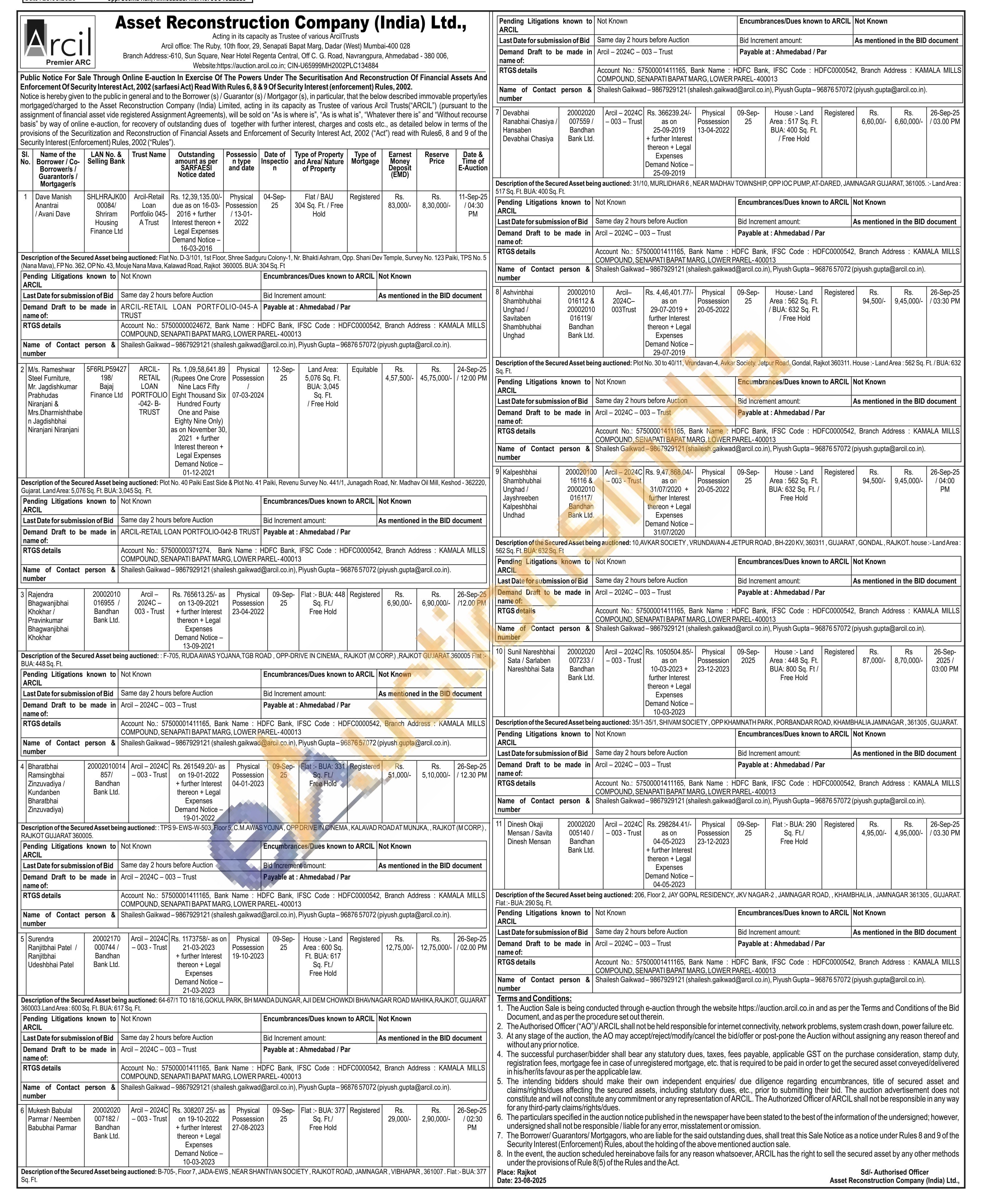 Description of the Secured Asset being auctioned: 31/10, MURLIDHAR 6, NEAR MADHAV TOWNSHIP, OPP IOC PUMP, AT-DARED, JAMNAGAR GUJARAT, 361005.-Land Area: 517 Sq. Ft. BUA: 400 Sq. Ft