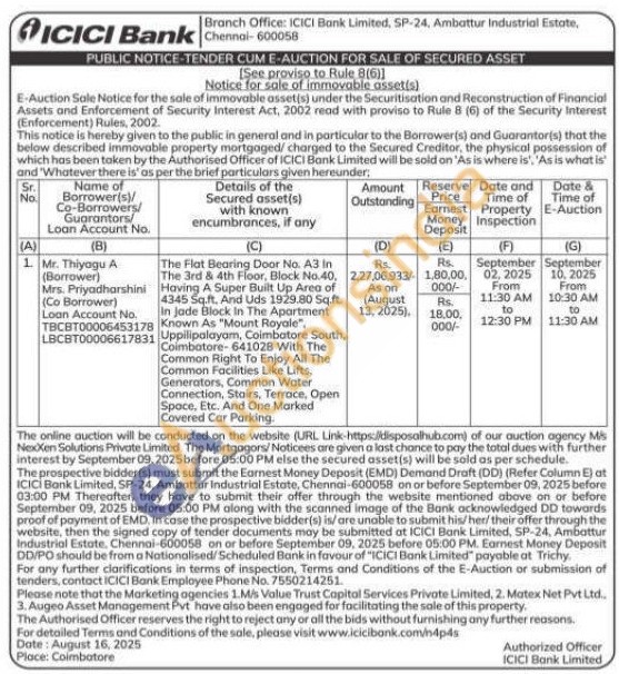 The Flat Bearing Door No. A3 In The 3rd & 4th Floor, Block No.40, Having A Super Built Up Area of 4345 Sq.ft. And Uds 1929.80 Sq.ft. In jade Block In The ApartmentUpilipalyam Coimbatore-641028 With The Common Right To Enjoy All The Common Facilities Like Lifts, Generators, Common Water Connection, Stairs, Terrace, Open Space, Etc. And One Marked Covered Car Parking.