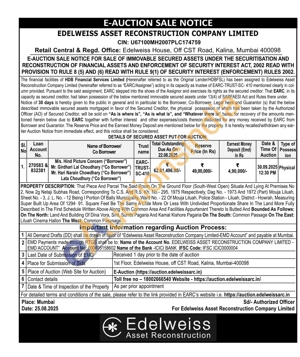 PROPERTY DESCRIPTION: That Piece And Parcel The Said Room On The Ground Floor (South-West Open) Situate And Lying At Premises No 2, Now 2g Netaji Subhas Road, Corresponding To C.S. And R.S. Kh. No.- 295, 1975 Respectively, Dag No. 1973 And 1972 (Part) Mouja Liluah, Sheet No. 3, J. L. No. - 12 Being I Portion Of Bally Municipality, Ward No. - 22 Of Mouja Liluah, Police Station - Liluah, District - Howrah, Measuring Super Built Up Area Of 1294- 91. Square Feet Be The Same A Little More Or Less With Undivided Proportionate Share In The Land More Fully Described In The First Schedule Written Above Along With Common Area And Facilities Appurtenant Thereto Is Butted And Bounded As Follows: On The North: Land And Building Of Dina Vora, Smt, Sunita Pagaria And Kamal Kishore Pagaria On The South: Common Passage On The East: Liluah Cinema Hallon The West: Common Pasasage