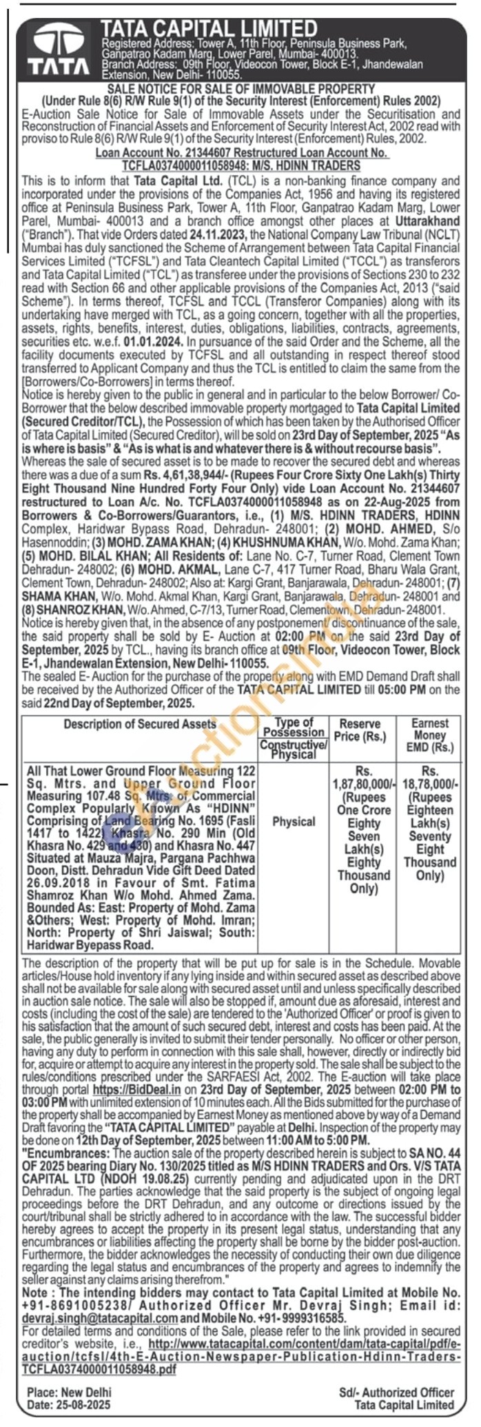 All That Lower Ground Floor Measuring 122 Sq. Mtrs. and Upper Ground Floor Measuring 107.48 Sq. Mtrs. of Commercial Complex Popularly Known As "HDINN" Comprising of Land Bearing No. 1695 (Fasli 1417 to 1422) Khasra No. 290 Min (Old Khasra No. 429 and 430) and Khasra No. 447 Situated at Mauza Majra, Pargana Pachhwa Doon, Distt. Dehradun Vide Gift Deed Dated 26.09.2018 in Favour of Smt. Fatima Shamroz Khan W/o Mohd. Ahmed Zama. Bounded As: East: Property of Mohd. Zama &Others; West: Property of Mohd. Imran; North: Property of Shri Jaiswal; South: Haridwar Byepass Road