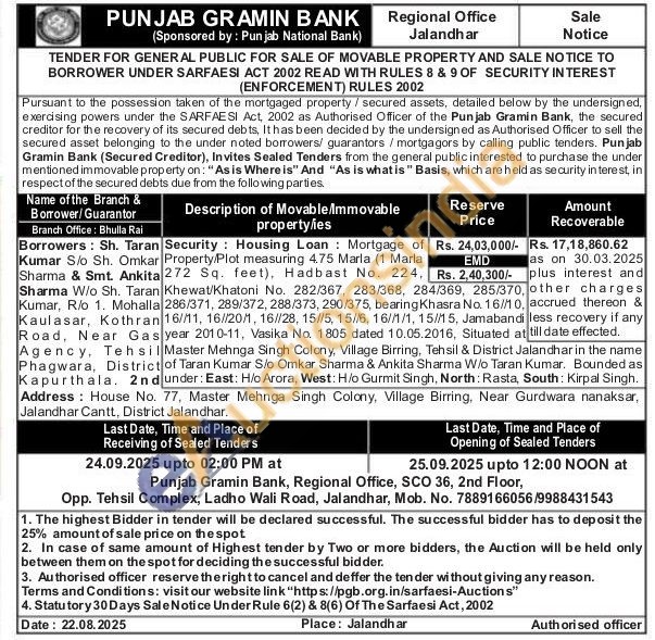 Security: Housing Loan: Mortgage of Property Plot measuring 4.75 Marla (1 Marla 272 Sq. feet), Hadbast No. 224 Khewat/Khatoni No. 282/367, 283/368, 284/369, 285/370 286/371, 289/372, 288/373, 290/375, bearing Khasra No. 16//10 16//11, 16//20/1, 16//28, 15/15, 15/16, 16//1/1, 15//15, Jamabandi year 2010-11, Vasika No. 1805 dated 10.05.2016, Situated at Master Mehnga Singh Colony, Village Birring, Tehsil & District Jalandhar in the name of Taran Kumar S/o Omkar Sharma & Ankita Sharma W/o Taran Kumar. Bounded as under: East: H/o Arora, West: H/o Gurmit Singh, North: Rasta, South: Kirpal Singh