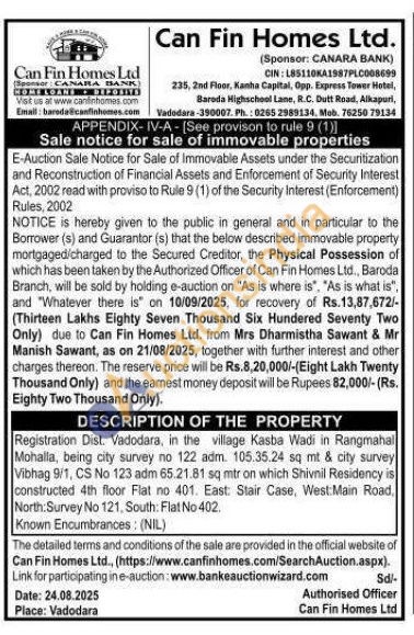 Registration Dist. Vadodara, in the village Kasba Wadi in Rangmahal Mohalla, being city survey no 122 adm. 105.35.24 sq mt & city survey Vibhag 9/1, CS No 123 adm 65.21.81 sq mtr on which Shivnil Residency is constructed 4th floor Flat no 401. East: Stair Case, West Main Road, North: Survey No 121, South: Flat No 402.