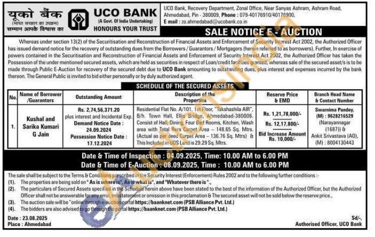 Residential Flat No. A/101, 1st Floor, "Takshashila AIR", B/h. Town Hall, Ellis Bridge, Ahmedabad-380006. Consist of Hall, Dining, Four Bed Rooms, Kitchen, Wash area with Total Rera Carpet Area 148.65 Sq. Mirs. (Actual as per deed Carpet Area-136.76 Sq. Mtrs) & This Included in UDS Land is 29.29 Sq. Mtrs.